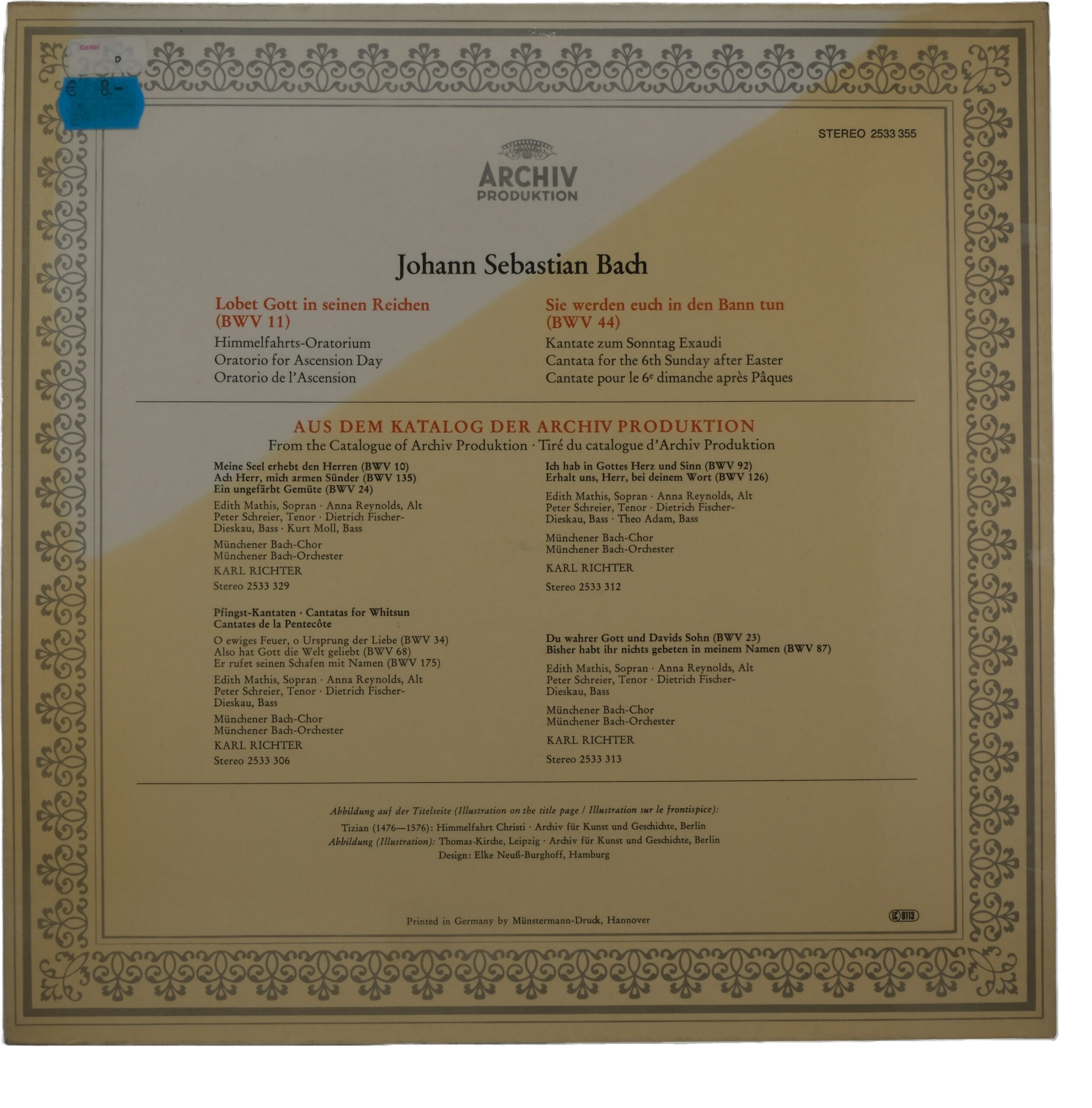 Contenu du disque:, Lobet Gott In Seinen Reichen (Himmelfahrts-Oratorium, BWV 11), A1, Chor, 4:46, A2, Rezitativ (Tenor), 0:37, A3, Rezitativ (Bass), 1:29, A4, Arie (Alt), 9:45, A5, Rezitativ (Tenor), 0:27, A6, Choral, 1:10, A7, Rezitativ (Tenor, Bass), 1:02, A8, Rezitativ (Alt), 0:48, A9, Rezitativ (Tenor), 0:55, A10, Arie (Sopran), 7:02, B1, Choral, 3:59, Sie Werden Euch In Den Bann Tun (Kantate Zum Sonntag Exaudi, BWV 44), B2, Chor (Tenor, Bass), 2:42, B3, Chor, 1:53, B4, Arie (Alt), 5:20, B5, Choral (Chor-Tenor), 1:12, B6, Rezitativ (Bass), 1:02, B7, Arie (Sopran), 6:10, B8, Choral, 1:00