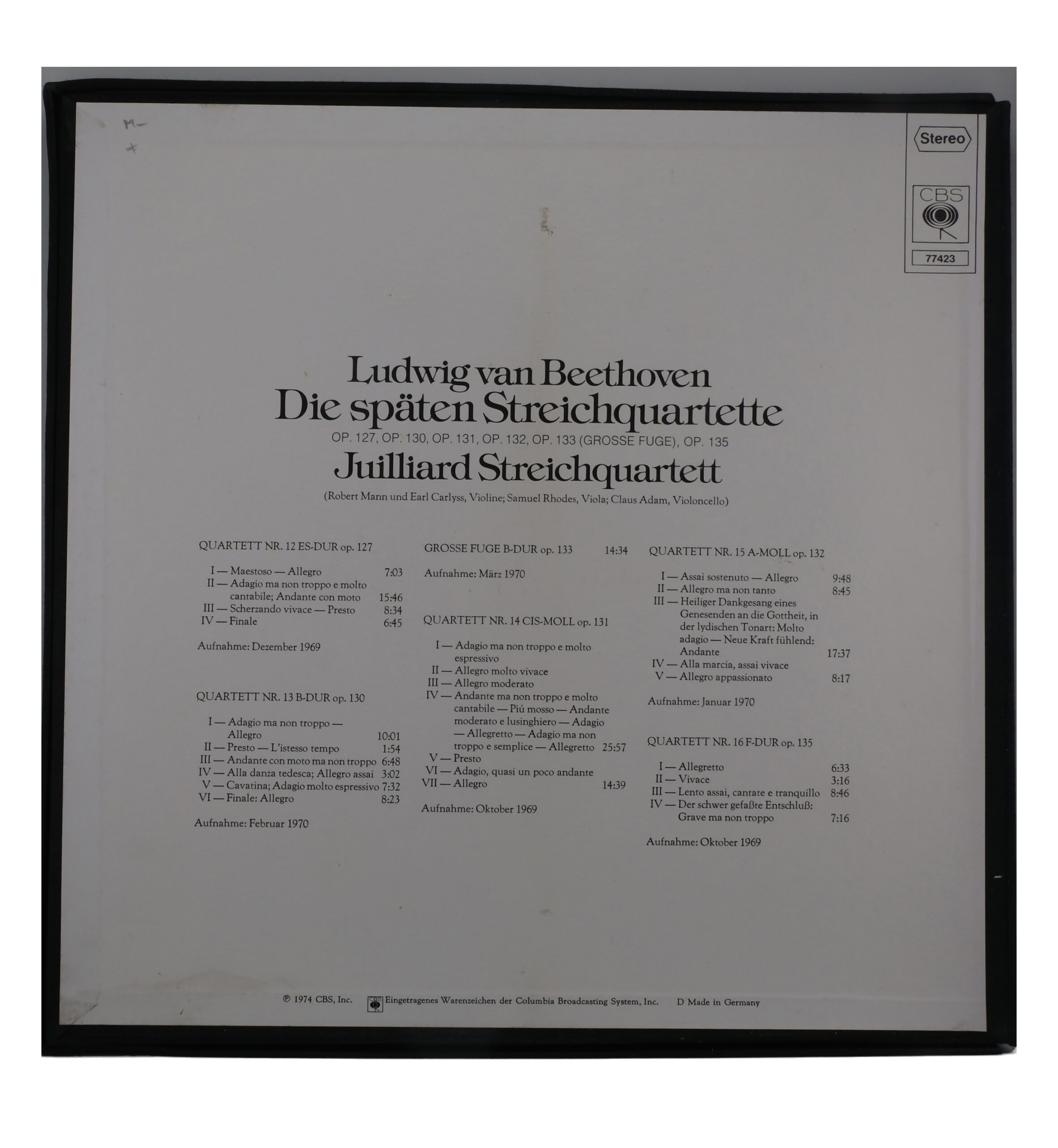Contenu du disque:, Quartett Nr. 12 Es-Dur Op. 127, A1, I – Maestoso – Allegro, 7:03, A2, II – Adagio Ma Non Troppo E Molto Cantabile; Andante Con Moto – Adagio Molto Espressivo, 15:46, B1, III – Scherzando Vivace – Presto, 8:34, B2, IV – Finale, 6:45, Quartett Nr. 13 B-Dur Op. 130, C1, I – Adagio Ma Non Troppo – Allegro, 10:01, C2, II – Presto – L'istesso Tempo, 1:54, C3, III – Andante Con Moto Ma Non Troppo, 6:48, C4, IV – Alla Danza Tedesca; Allegro Assai, 3:02, C5, V – Cavatina. Adagio Molto Espressivo, 7:32, D1, VI – Finale: Allegro, 8:23, D2, Grosse Fuge B-Dur Op. 133, 14:34, Quartett Nr. 14 Cis-Moll Op. 131, 25:57, E1.1, I – Adagio Ma Non Troppo E Molto Espressivo, E1.2, II – Allegro Molto Vivace, E1.3, III – Allegro Moderato, E1.4, IV – Andante Ma Non Troppo E Molto Cantabilie – Piú Mosso – Andante Moderato E Lusinghiero – Adagio – Allegretto – Adagio Ma Non Troppo E Semplice – Allegretto, Quartett Nr. 14 Cis-Moll Op. 131 (Conclusion), 14:39, F1.1, V – Presto, F1.2, VI – Adagio, Quasi Un Poco Andante, F1.3, VII – Allegro, Quartett Nr. 15 A-Moll Op. 132, F2, I – Assai Sostenuto – Allegro, 9:48, F3, II – Allegro Ma Non Tanto, 8:45, G1, III – Heiliger Dankgesang Eines Genesenden An Die Gottheit, In Der Lydischen Tonar: Molto Adagio – Neue Kraft Fühlend: Andante, 17:37, G2, IV – Alla Marcia, Assai Vivace / V – Allegro Appassionato, 8:17, Quartett Nr. 16 F-Dur Op. 135, H1, I – Allegretto, 6:33, H2, II – Vivace, 3:16, H3, III – Lento Assai, Cantante E Tranquillo, 8:46, H4, IV – Der Schwer Gefaßte Entschluß: Grave, Ma Non Troppo Tratto, 7:16