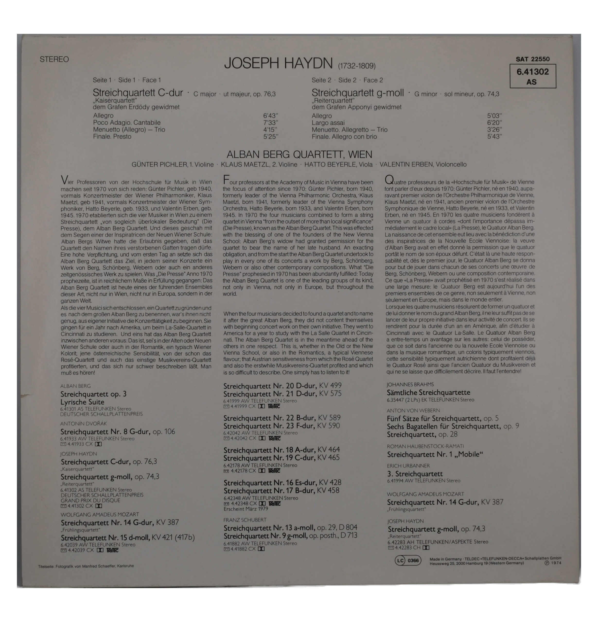 Voici un enregistrement de Joseph Haydn, interprété par l’Alban Berg Quartett, sorti en 1973 sous le label Telefunken. Le disque propose des œuvres remarquables telles que le « Kaiserquartett » (Op. 76,3) et le « Reiterquartett » (Op. 74,3), offrant une expérience musicale riche et immersive. L’enregistrement inclut des mouvements variés, allant de l’Allegro énergique au Poco Adagio délicat, en passant par le Menuetto entraînant et les finales éblouissants. Un excellent choix pour les amateurs de musique classique et les collectionneurs.
