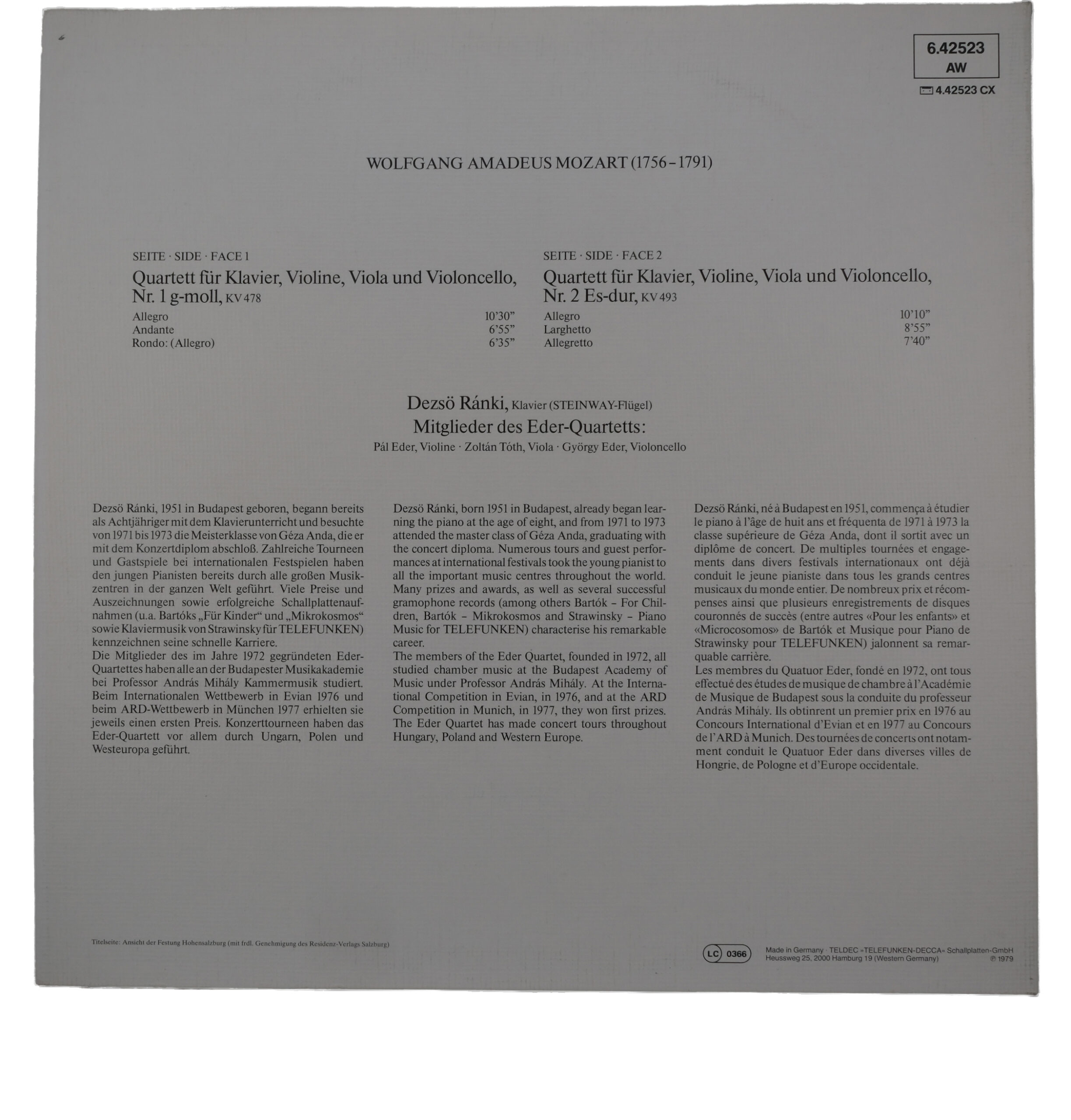 Découvrez un enregistrement classique de 1981, mettant en lumière le génie intemporel de Mozart avec ce disque stéréo édité par le label Telefunken. Cet album présente deux de ses remarquables quatuors pour piano : le Quatuor pour piano, violon, alto et violoncelle n° 1 en sol mineur, KV 478, et le Quatuor n° 2 en mi bémol majeur, KV 493. Les pièces sont interprétées par Dezso Ranki, accompagné des membres de l’Eder Quartett. Chaque composition explore les riches textures et les dynamiques complexes qui caractérisent la musique de chambre de Mozart. Le premier quatuor commence avec un Allegro entraînant, suivi d’un Andante délicat, se terminant par un Rondo vibrant. Le second quatuor offre un Allegro lumineux, un Larghetto émouvant, et se clôture par un Allegretto enjoué.