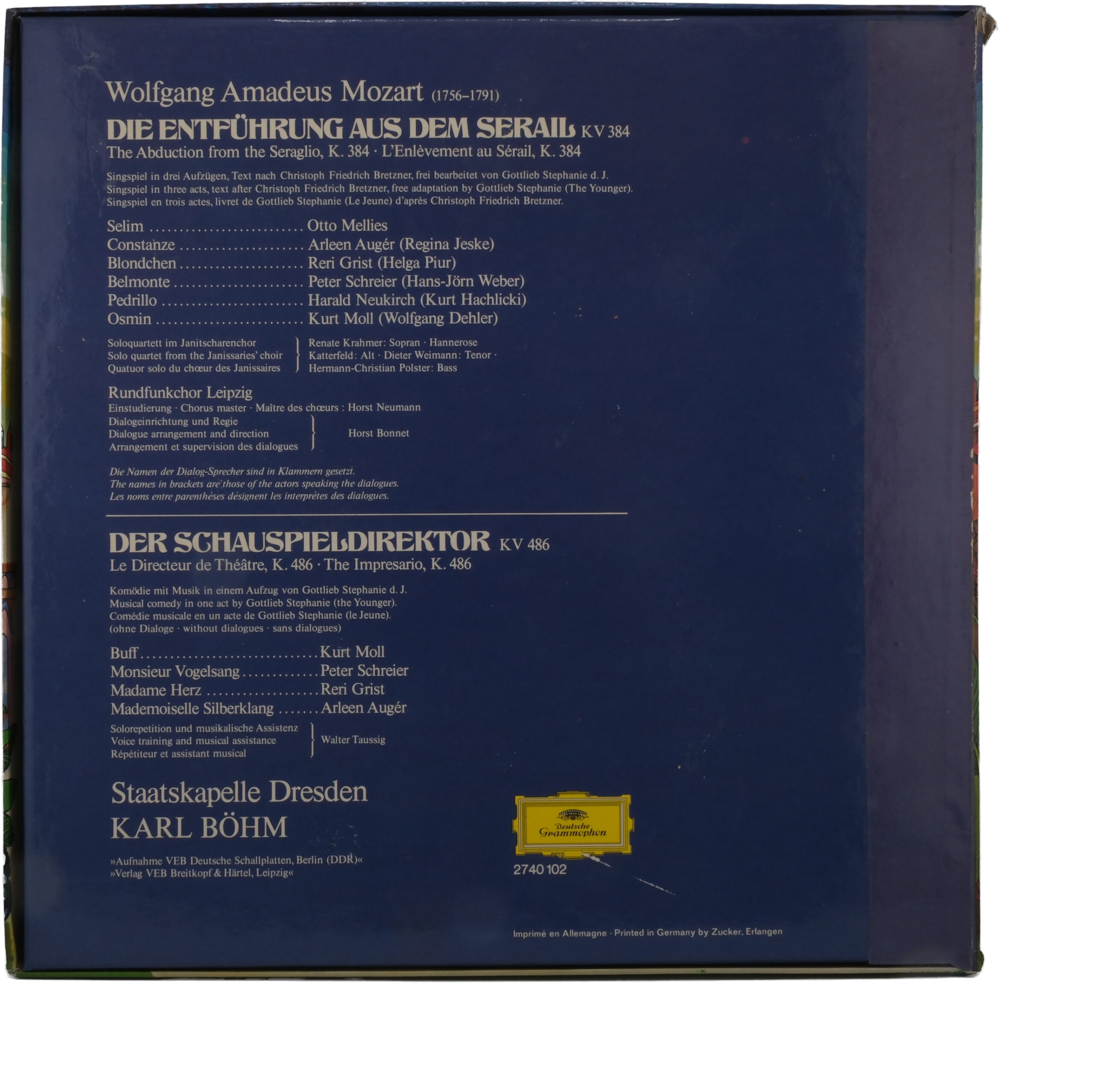 Cet enregistrement de Wolfgang Amadeus Mozart, dirigé par le chef d’orchestre renommé Karl Böhm, présente deux œuvres imperméables de l’opéra et de la comédie musicale : L’Enlèvement au Sérail et L’Impresario. Réalisé par le label prestigieux Deutsche Grammophon en 1974, cet album stéréo met en avant les talents vocaux de Arleen Augér, Reri Grist, Peter Schreier, Harald Neukirch, et Kurt Moll, accompagnés par l’orchestre admirable Staatskapelle Dresden.
