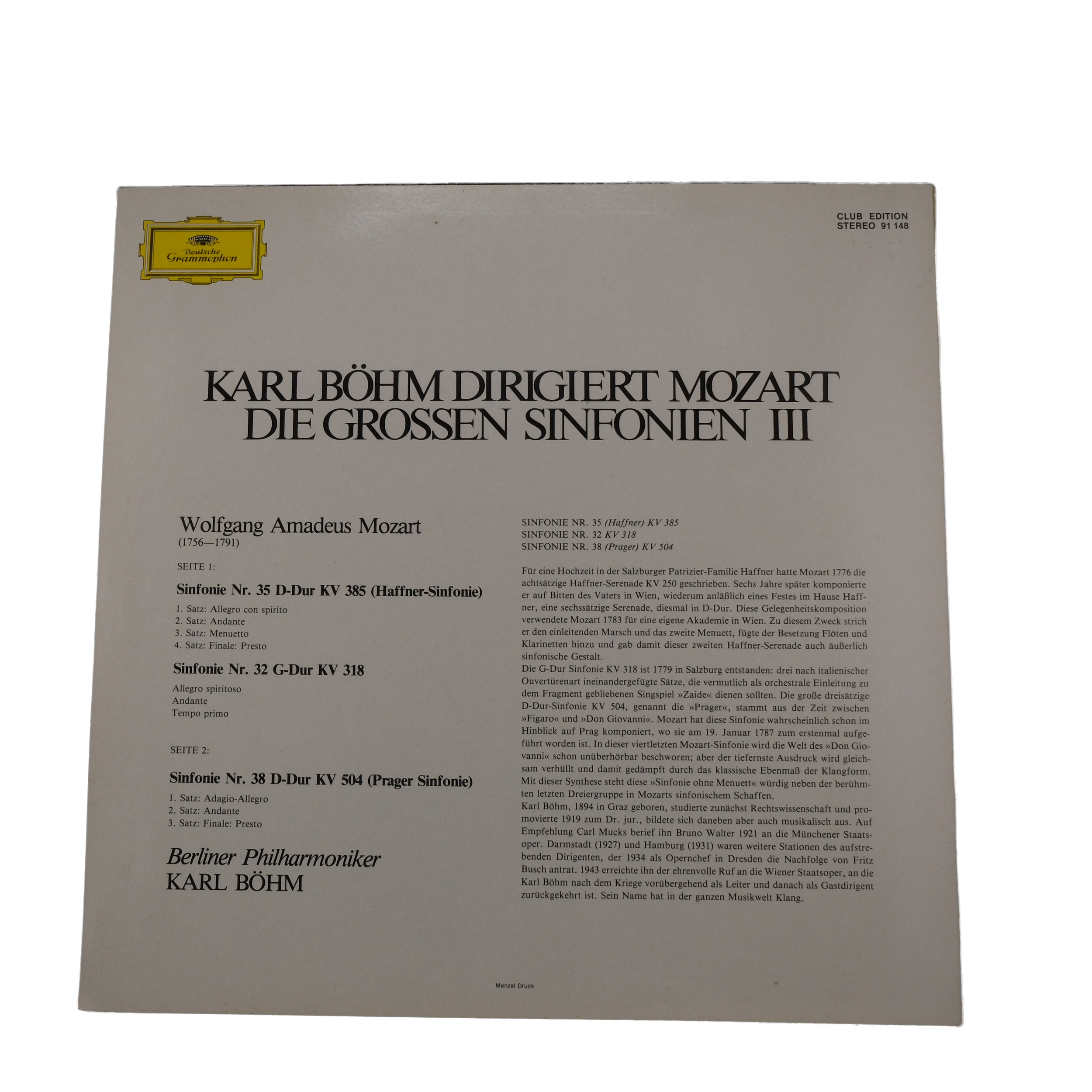 Contenu du disque:, Sinfonie Nr. 35, D-Dur, KV 385 (Haffner-Sinfonie), A1, 1. Satz: Allegro Con Spirito, A2, 2. Satz: Andante, A3, 3. Satz: Menuetto, A4, 4. Satz: Finale Presto, Sinfonie Nr. 32, G-Dur KV 318, A5, Allegro Spiritoso, A6, Andante, A7, Tempo Primo, Sinfonie Nr. 38 D-Dur KV 504 (Prager Sinfonie), B1, 1. Satz: Adagio – Allegro, B2, 2. Satz: Andante, B3, 3. Satz: Finale Presto