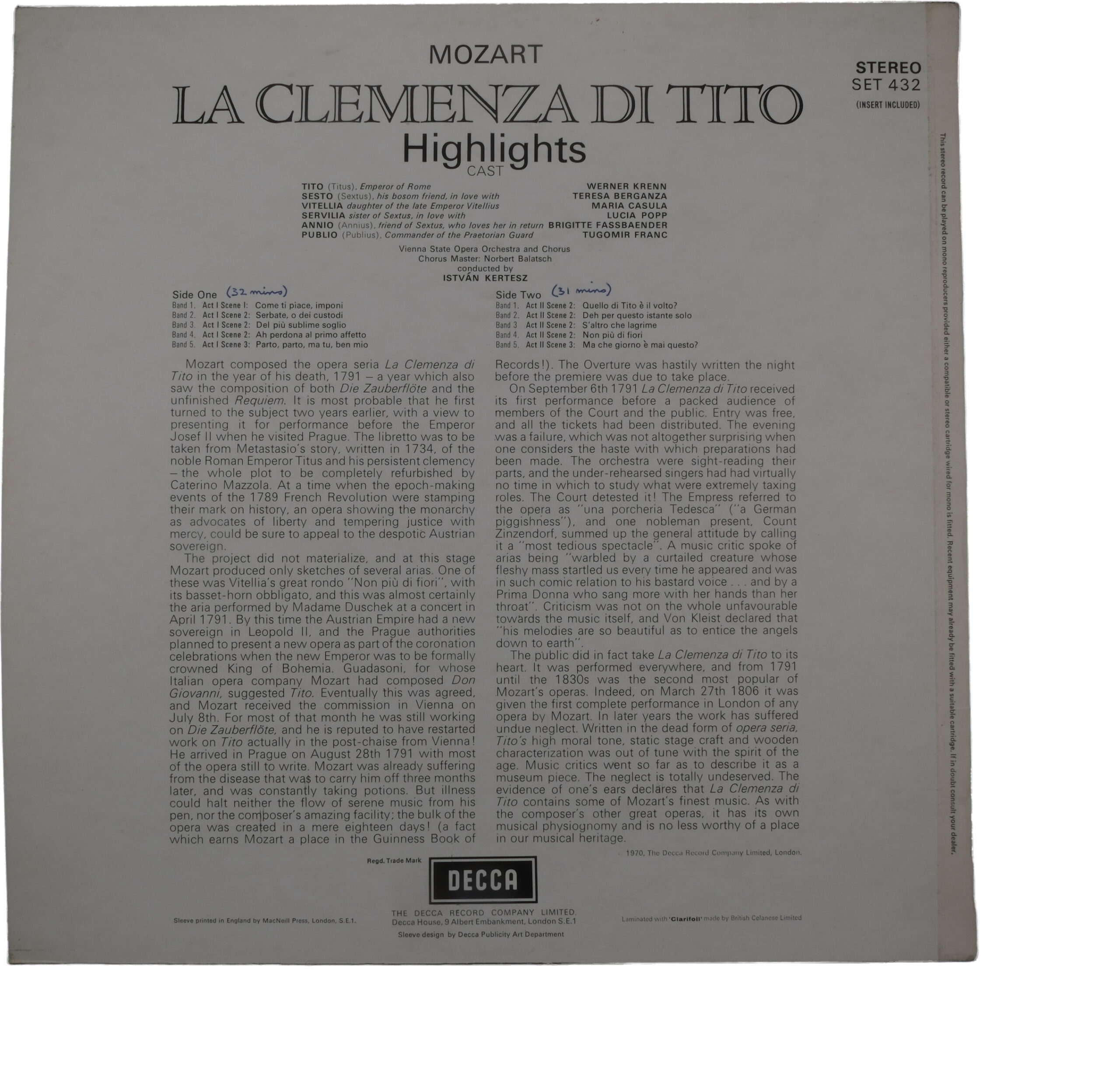 | Contenu | Contenu du disque:, A1, Come Ti Pace, Imponi, A2, Serbate, O Dei Custodi, A3, Deh Più Sublime Soglio, A4, Ah Perdona Al Primo Affetto, A5, Parto, Parto, Ma Tu, Ben Mio, B1, Quello Di Tito È Il Volto?, B2, Deh Per Questo Istante Solo, B3, S'altro Che Lagrime, B4, Non Piu Di Fiori, B5, Ma Che Giorno E Mai Questo? |