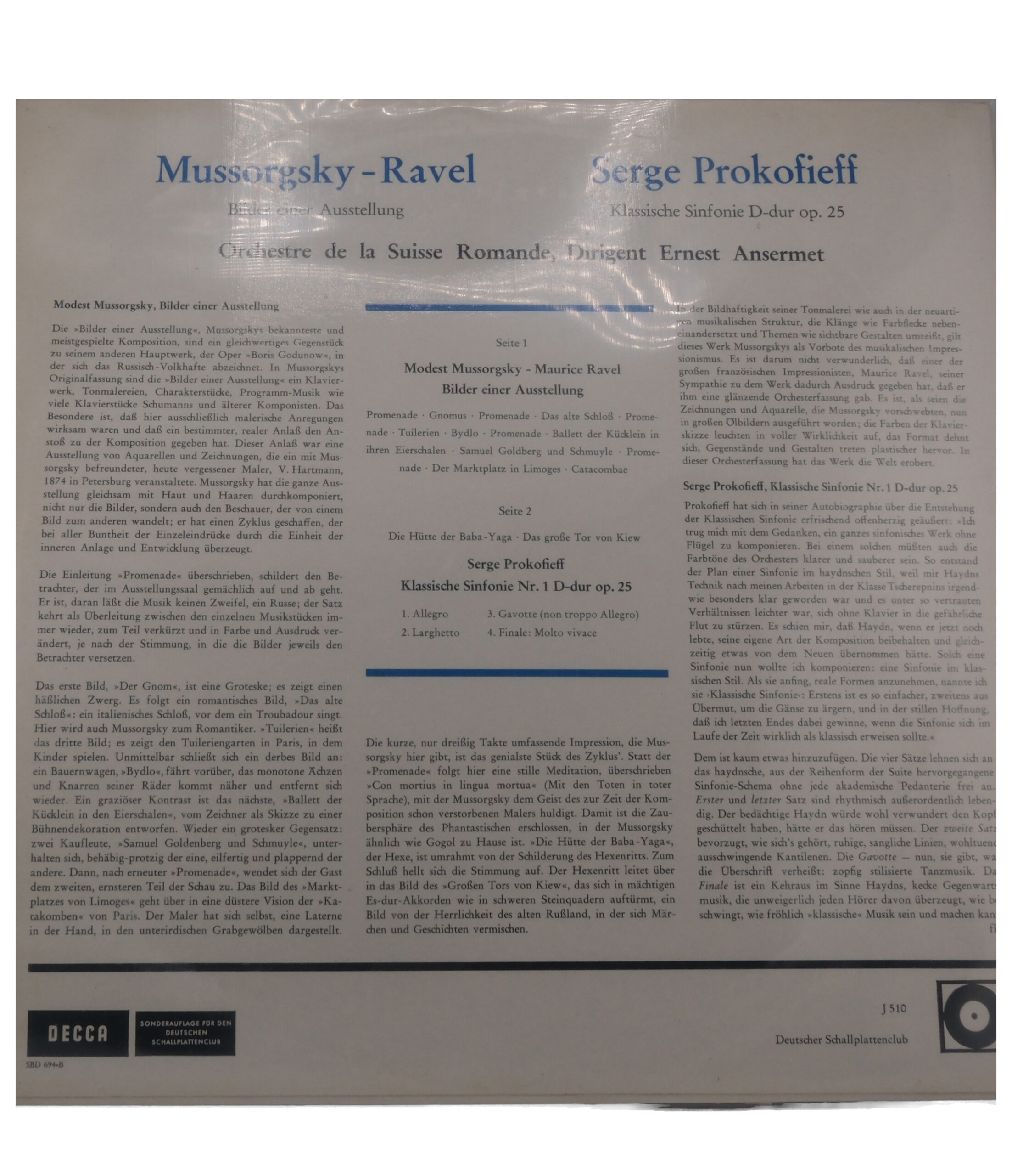 Contenu du disque:, Bilder Einer Ausstellung, A.a, Promenade, A.b, Gnomus, A.c, Promenade, A.d, Das Alte Schloß, A.e, Promenade, A.f, Spielende Kinder Im Streit, A.g, Bydio, A.h, Promenade, A.i, Ballett Der Küchlein In Ihren Eierschalen, A.j, Samuel Goldberg Und Schmuyle, A.k, Der Marktplatz In Limoges, A.l, Catacombae, B1.a, Die Hütte Der Baba-Yaga, B1.b, Das Große Tor Von Kiew, Klassische Sinfonie Nr. 1 D-Dur, Op. 25, B2, 1. Allegro, B3, 2. Larghetto, B4, 3. Gavotta – Non Troppo Allegro, B5, 4. Finale – Molto Vivace